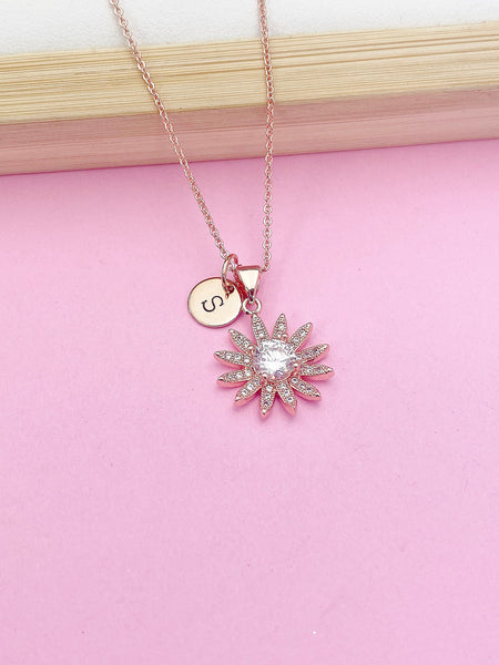 This is a rose gold tone micro pave brass cubic zirconia daisy charm with hand stamped initial charm on brass 18 inches chain.