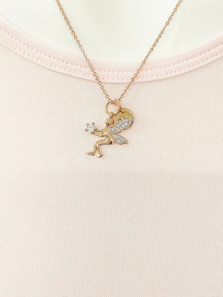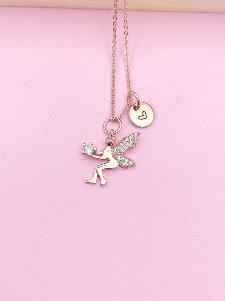 This is a gold tone Fairy with hand stamped initial charm on brass or stainless steel 18 inches chain.