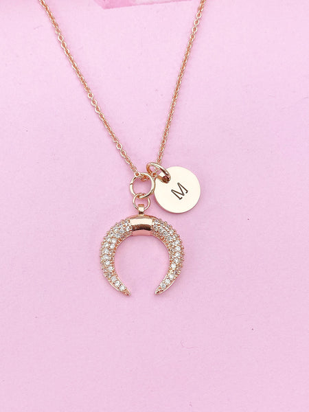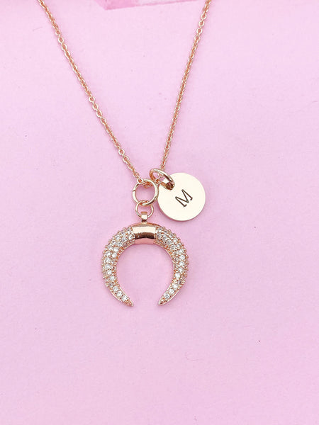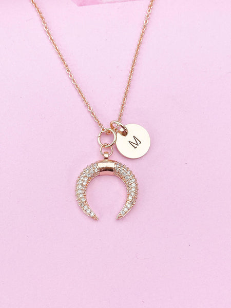 This is gold tone moon charm with hand stamped initial charm on brass or stainless-steel chain.