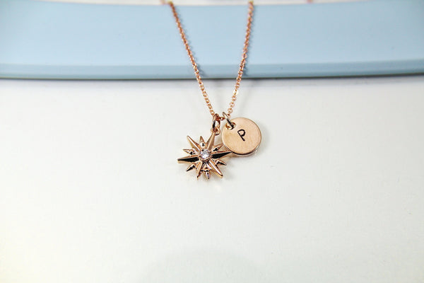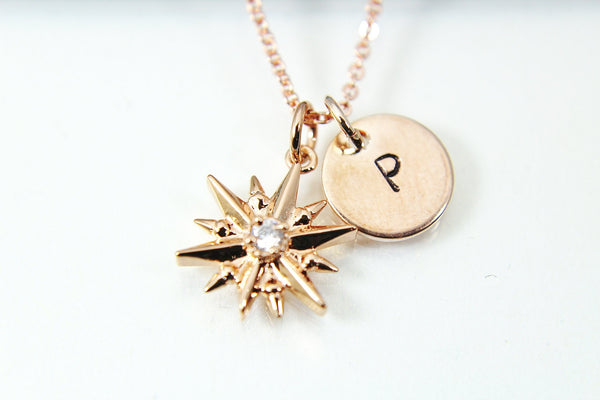 This is a beautiful high-quality Micro Pave AAA Cubic Zirconia star/snowflake pendant with hand stamp initial charm on the 18K Real Rose Gold Thick Plated over stainless steel 17.7 chains