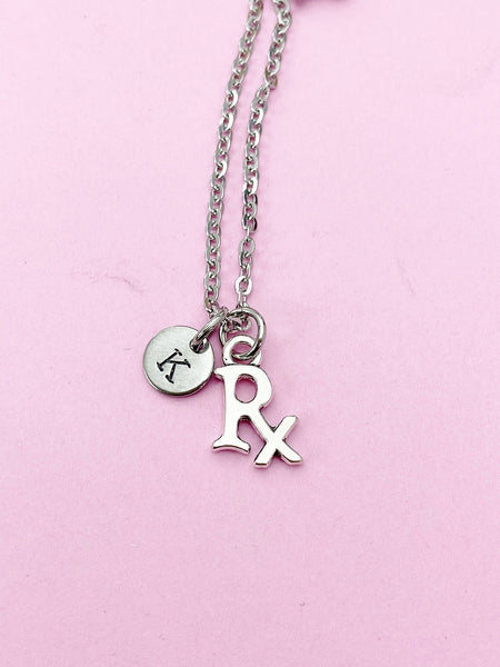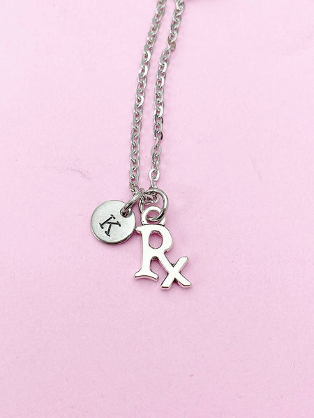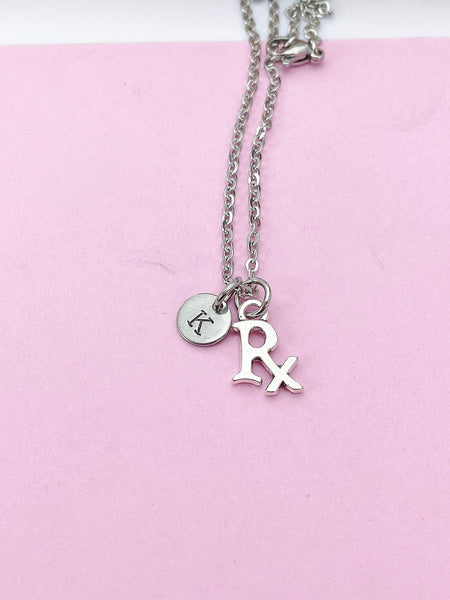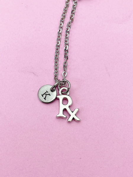 This is silver tone Rx charm with hand stamped initial charm on stainless-steel chain.