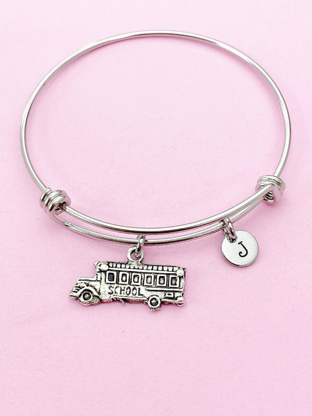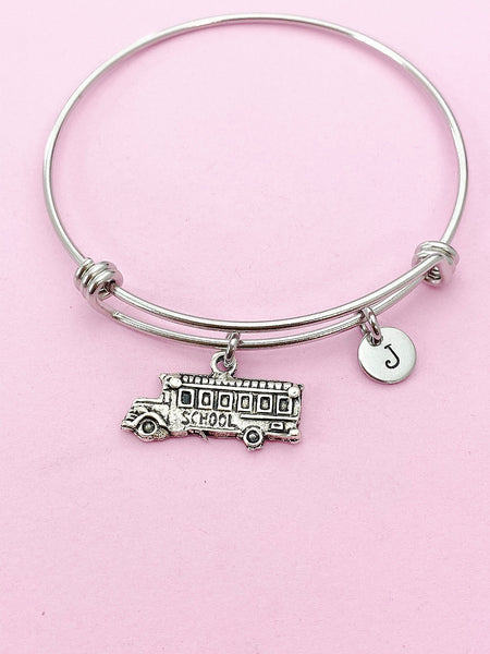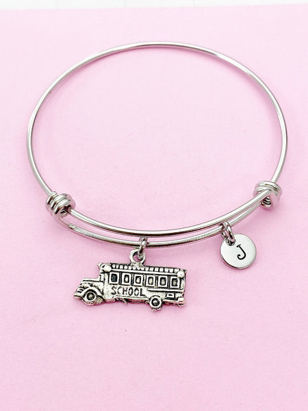 This is a silver-tone School Bus charm with hand stamped initial charm on stainless steel bracelet.