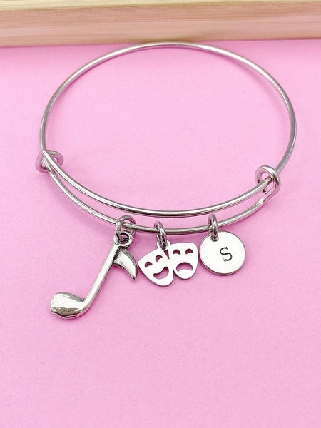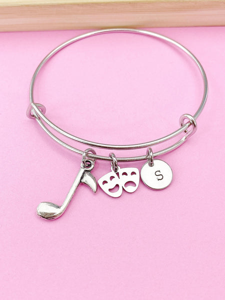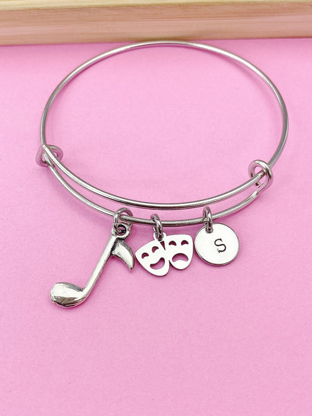 This is a silver-tone music note and mask charm with hand stamped initial charm on Tarnish Resistant stainless steel bracelet.