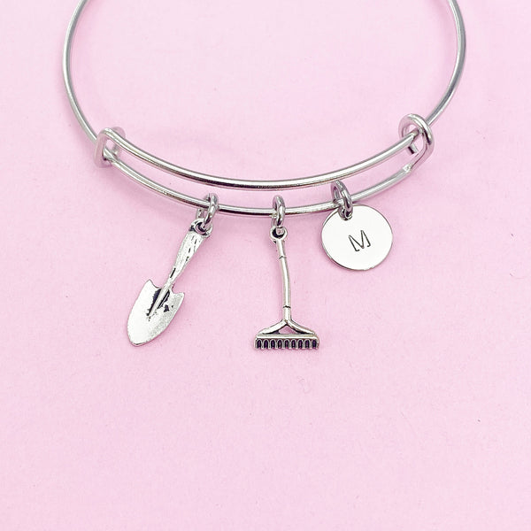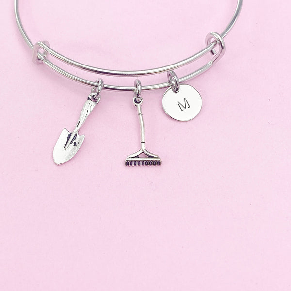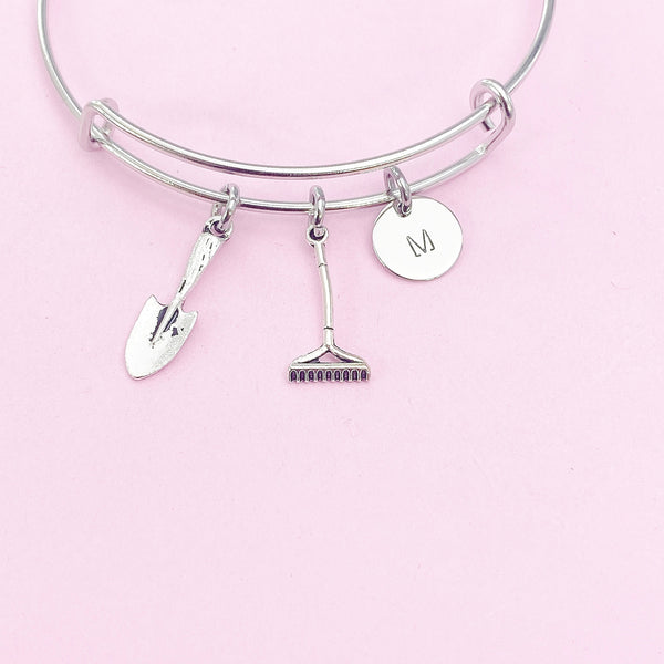 This is a silver-tone Spade Shovel Rack charm with hand stamped initial charm on stainless steel bracelet.