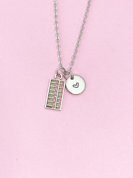 This is a silver -tone abacus charm with hand stamped initial charm on stainless steel 18 inches chain.