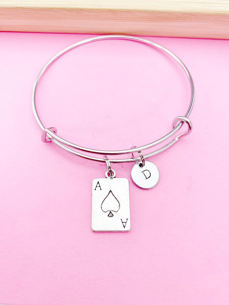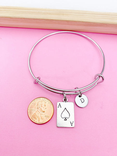 This is a silver-tone Ace of Spades charm with hand stamped initial charm on Tarnish Resistant stainless steel bracelet.
