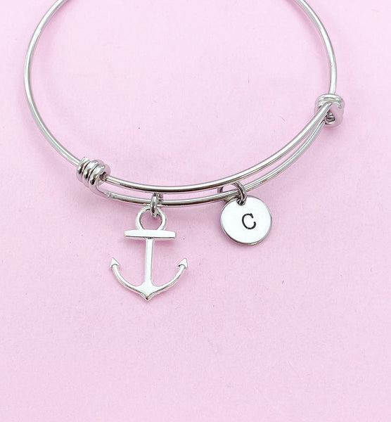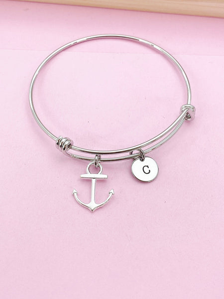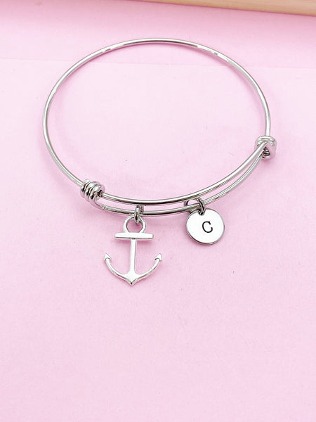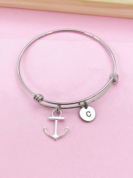 This is a silver-tone anchor charm with hand stamped initial charm on stainless steel bracelet.