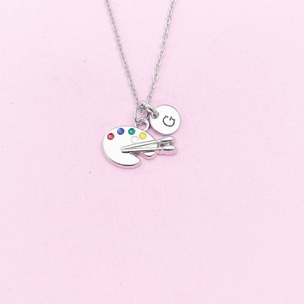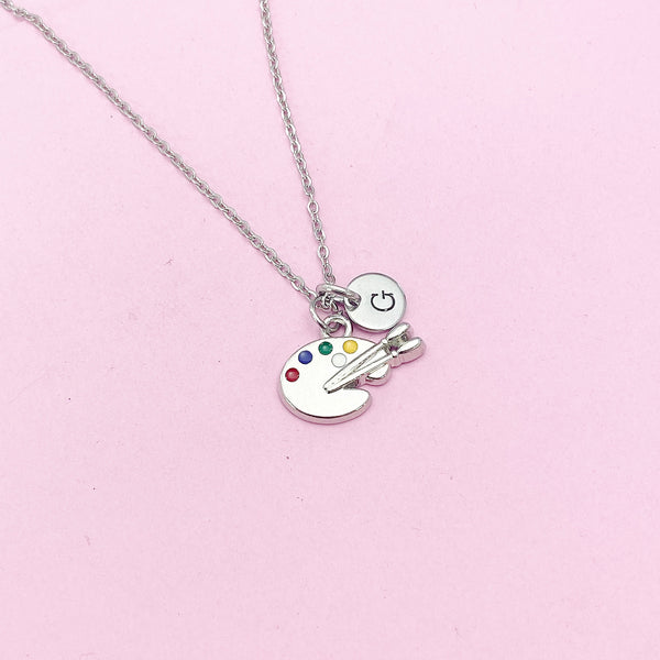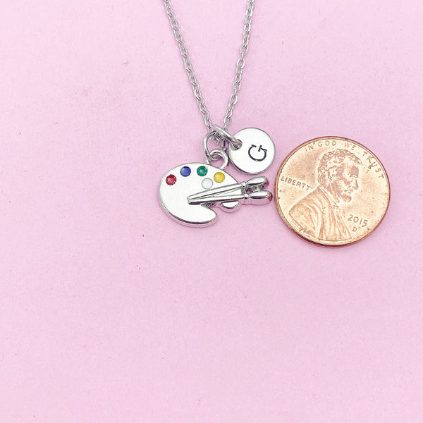 This is a silver-tone paint palette charm with hand stamped initial charm on brass or stainless-steel chain.