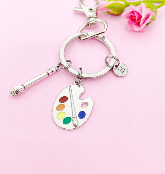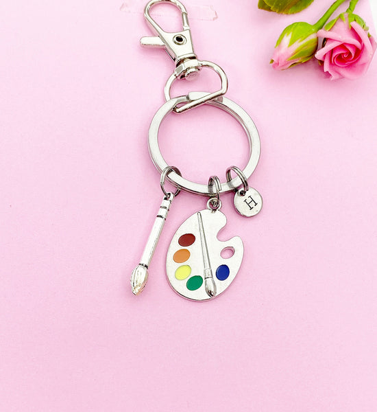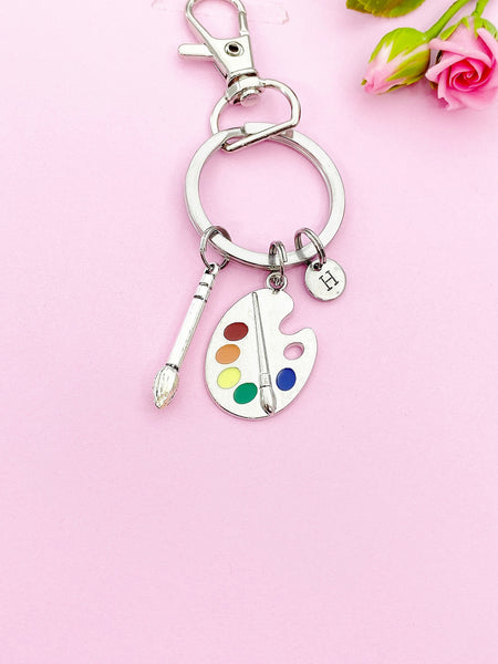 This is a silver-tone palette brush charm with hand stamped initial charm on keyring.