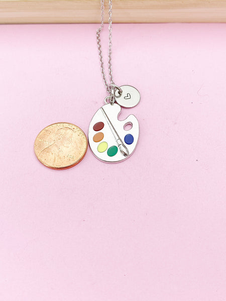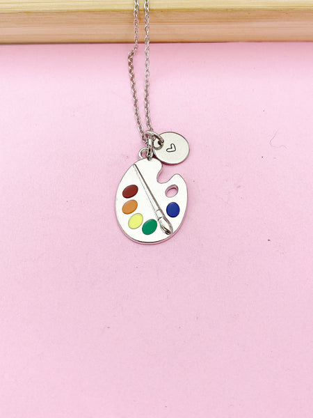 This is an alloy artist palette paintbrush charm with hand stamped initial charm on brass or tarnish resistant stainless-steel chain.