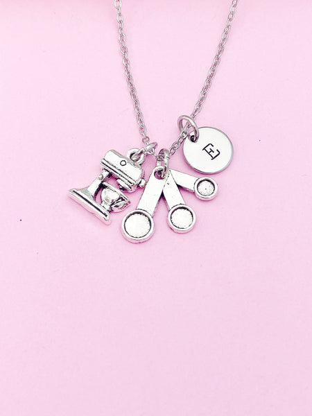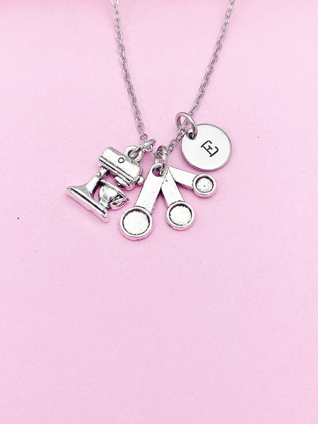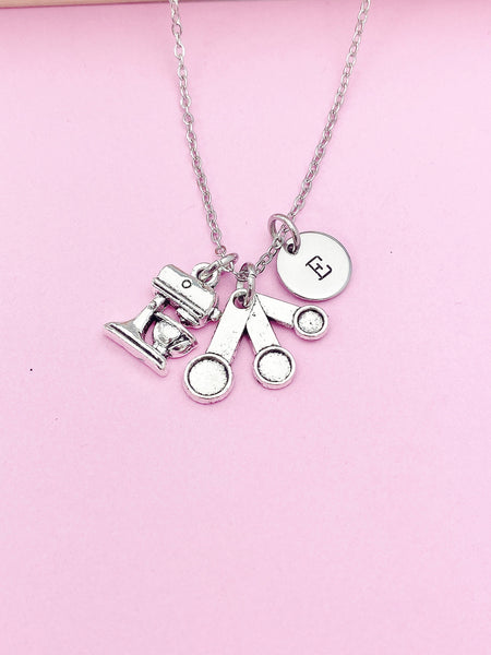 This is silver tone measuring spoon and mixer charm with hand stamped initial charm on stainless steel 18 inches chain.