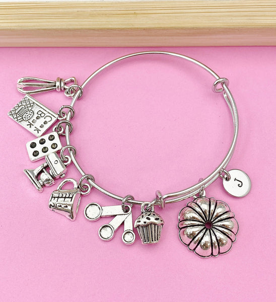 This is a silver tone Kitchen Mixer Bake Pan Measuring Cup Cookbook Cupcake Bundt Pan Cake charm with hand stamped initial charm on Tarnish Resistant stainless-steel bracelet.