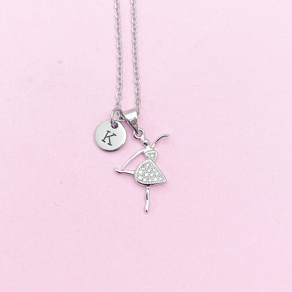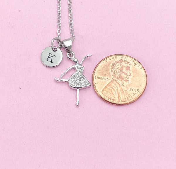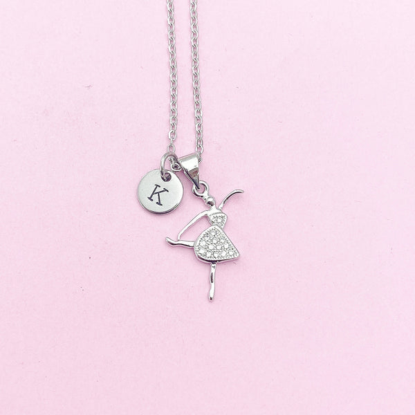 This is a silver-tone ballet dance charm with hand stamped initial charm on stainless-steel chain.