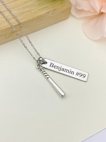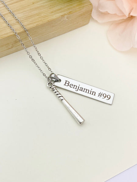 This is an engraving Name on stainless-steel and baseball bat charm with hand stamped initial charm on stainless steel necklace.