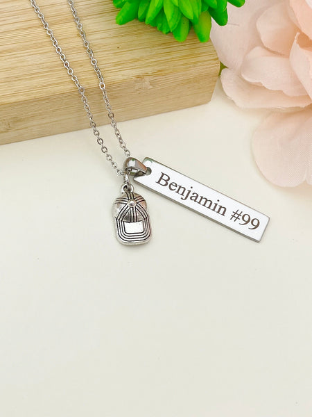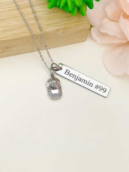 This is an engraving Name on stainless-steel and baseball cap charm with hand stamped initial charm on stainless steel necklace.