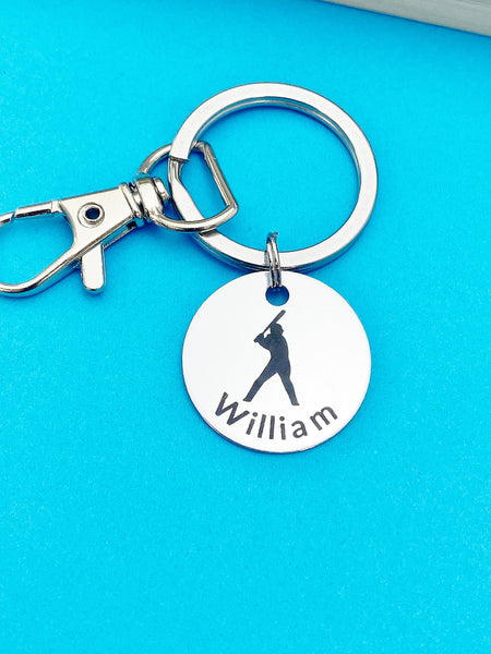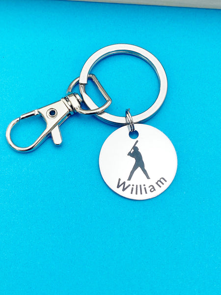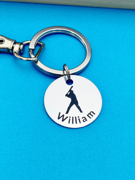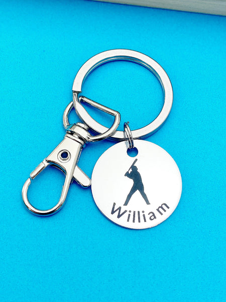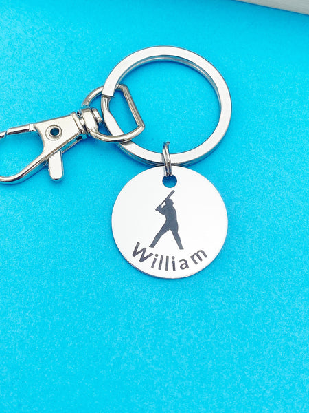 This is an engraving baseball and name on aluminum charm on split key ring.