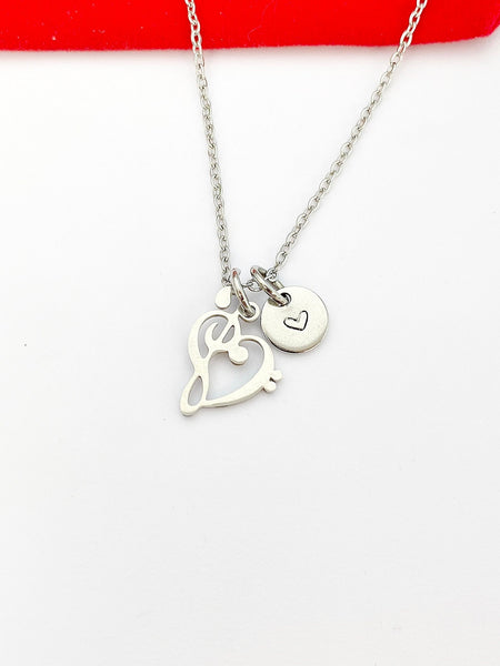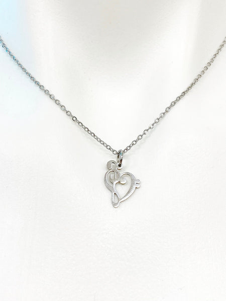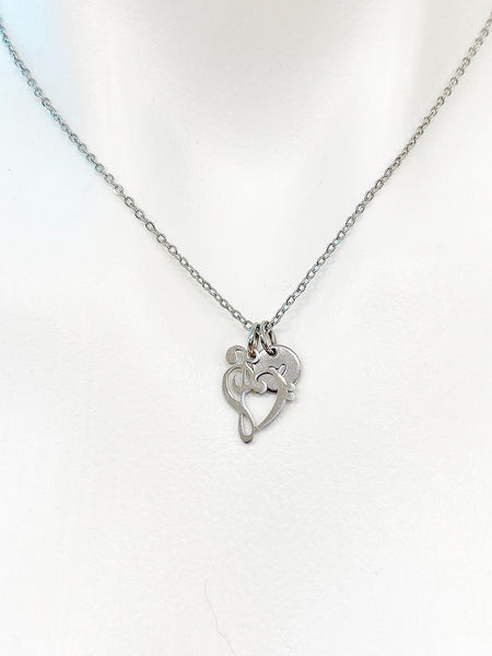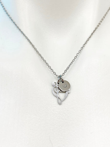 This is a stainless-steel Bass Clef Music Note charm with hand stamped initial charm on a stainless-steel chain.