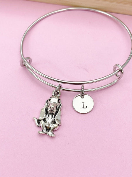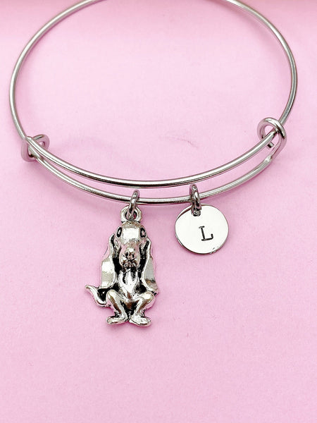This is a silver-tone Basset Hound Dog charm with hand stamped initial charm on stainless steel bracelet.