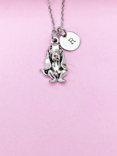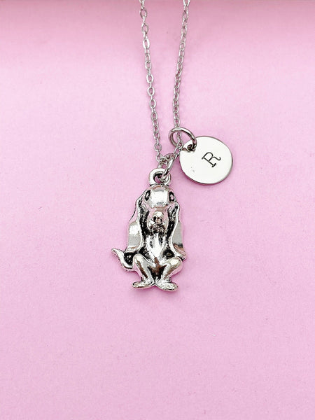 This is silver tone Basset Hound dog charm with hand stamped initial charm on brass or stainless-steel chain.