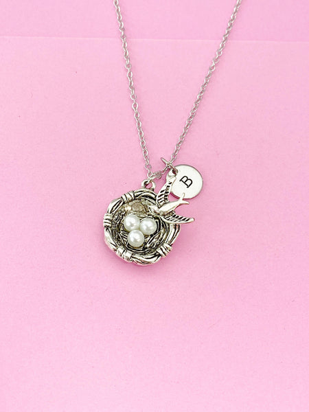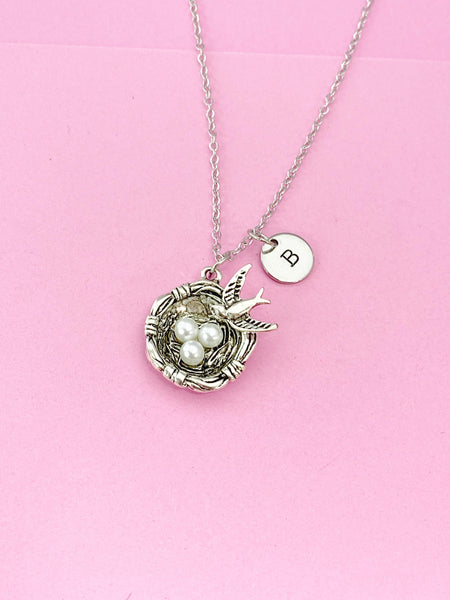 This is a silver-tone bird nest charm with hand stamped initial charm on tarnish resistant stainless-steel chain.