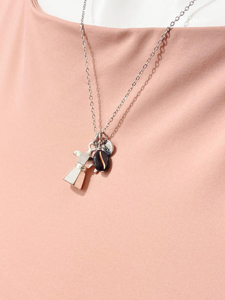 This is a silver-tone coffee bean and coffee maker charm with hand stamped initial charm on brass or tarnish resistant stainless-steel chain.
