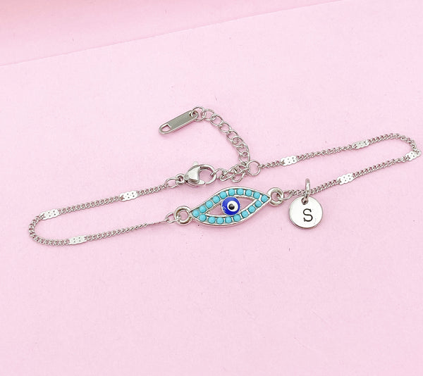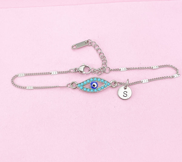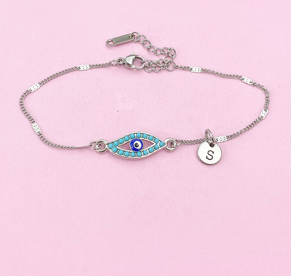 This is a silver-tone Evil Eye charm with hand stamped initial charm on stainless steel chain.