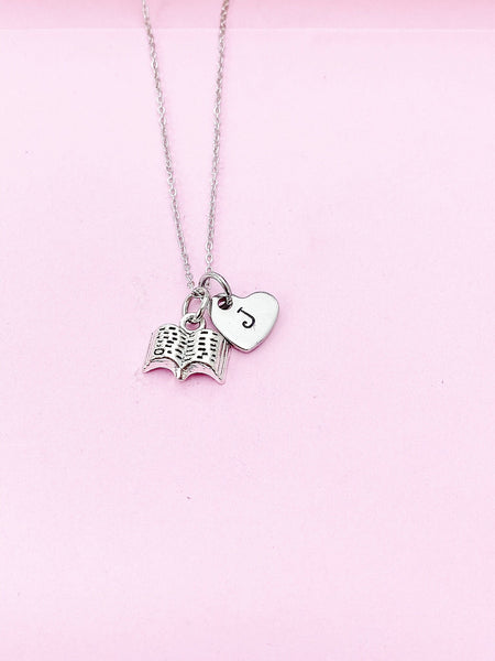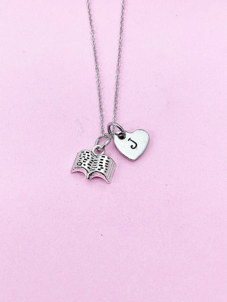 This is a silver-tone open book charm with hand stamped initial charm on stainless steel necklace.