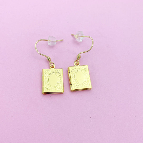 These are silver-toned SMALL book locket on brass or stainless steel ear hooks.