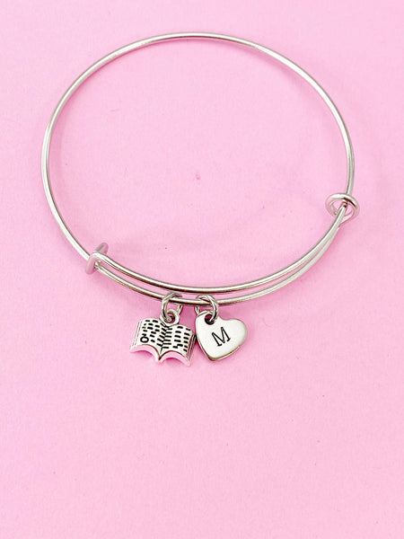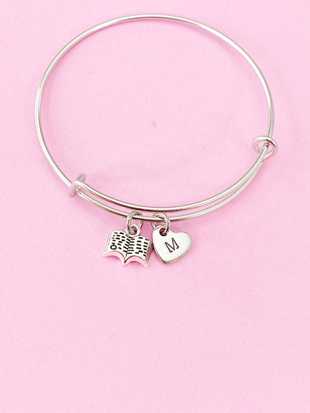This is a silver-tone Open Book charm with hand stamped initial charm on stainless steel bracelet.