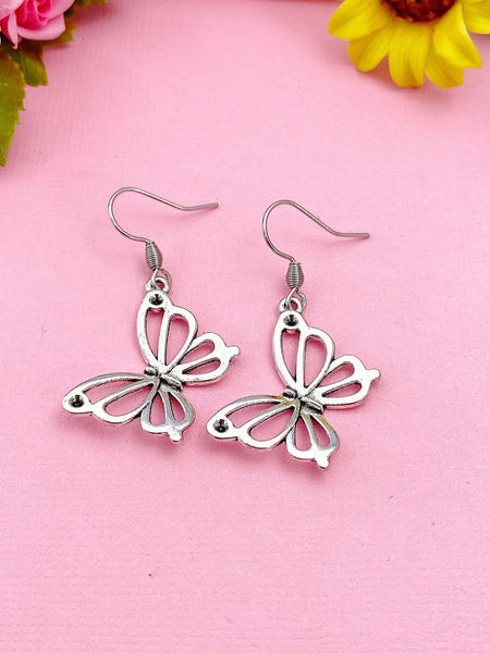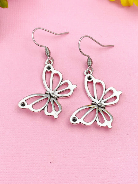 These are silver toned butterfly charms with stainless steel ear hooks.