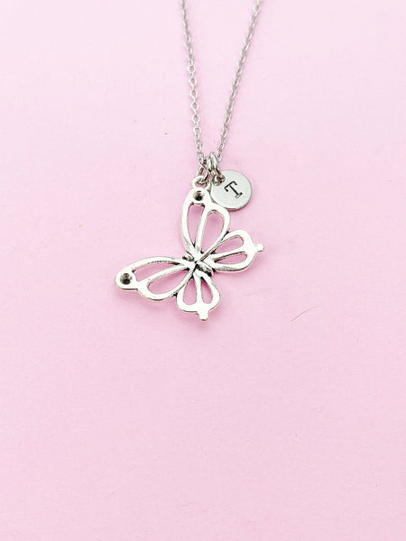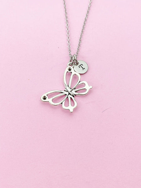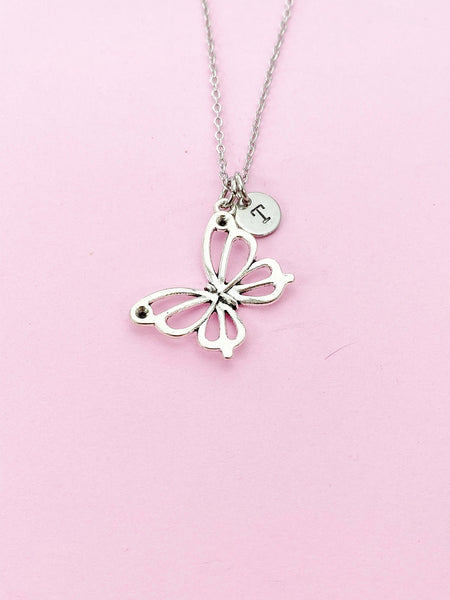 This is silver tone butterfly charm with hand stamped initial charm on brass or stainless-steel chain.