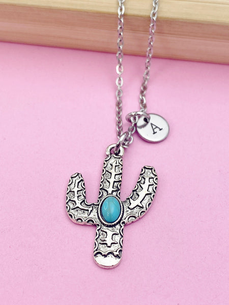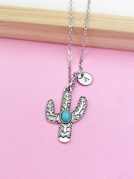 This is silver tone cactus charm with hand stamped initial charm on stainless steel 18 inches chain.