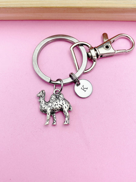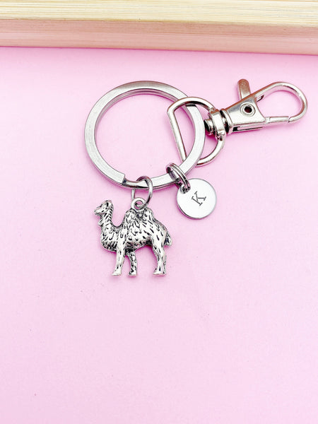 This is a silver-tone camel charm with hand stamped initial charm on keyring.