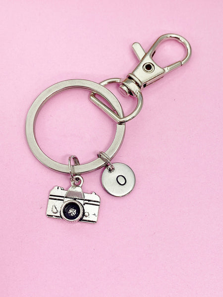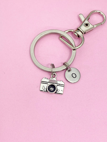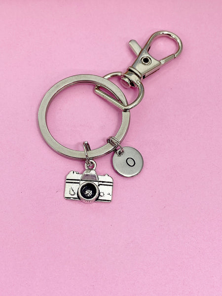 This is a silver-tone camera charm with hand stamped initial charm on keyring.