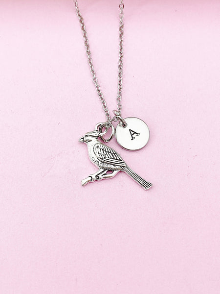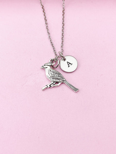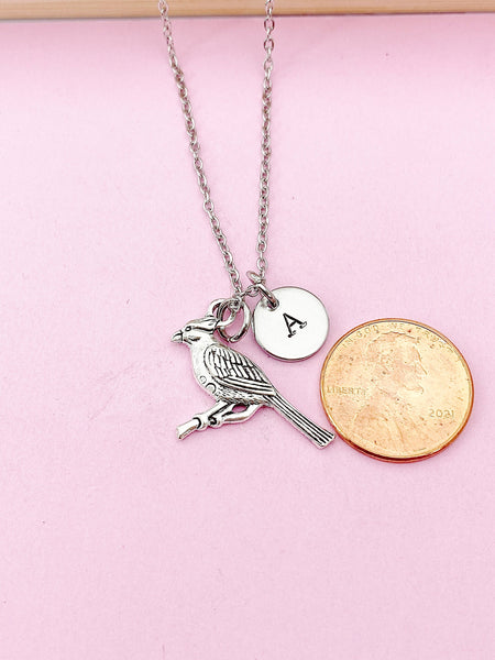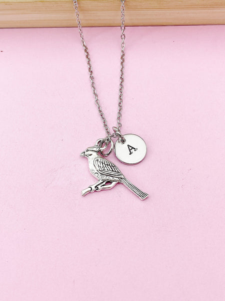 This is silver-tone alloy cardinal charm with hand stamped initial charm on brass or tarnish resistant stainless-steel chain.