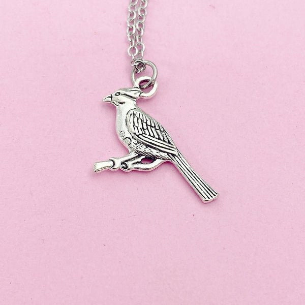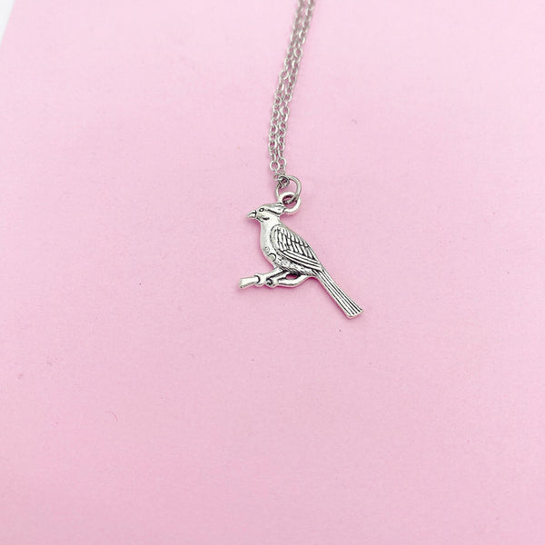 This is a silver-tone cardinal charm on stainless steel necklace.