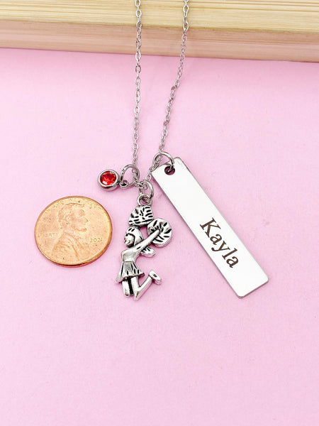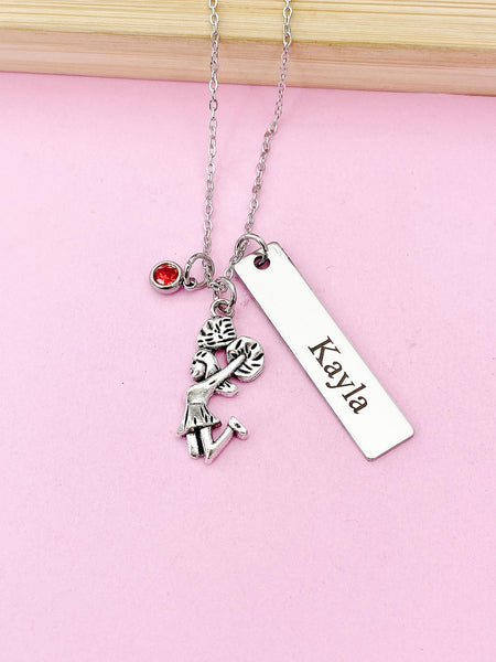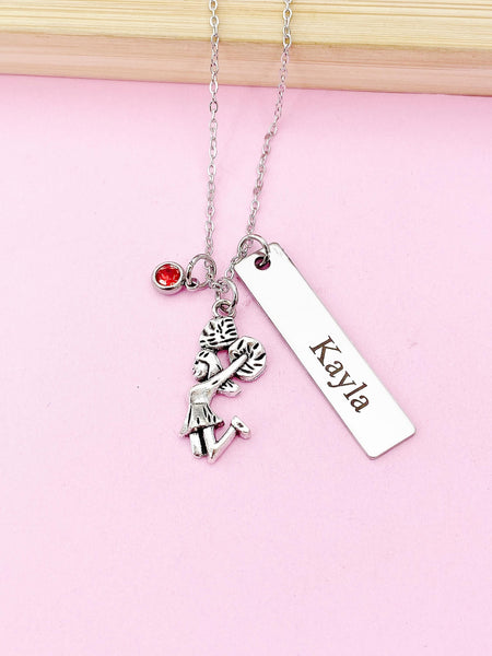 This is an engraving Name on stainless-steel and cheerleader charm with hand stamped initial charm and birthstone charm on stainless steel necklace.