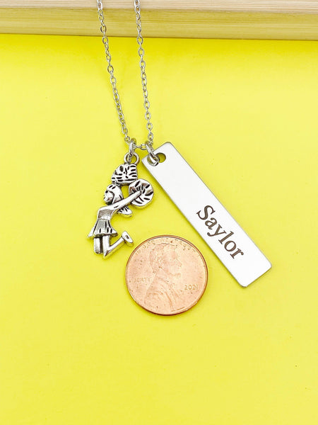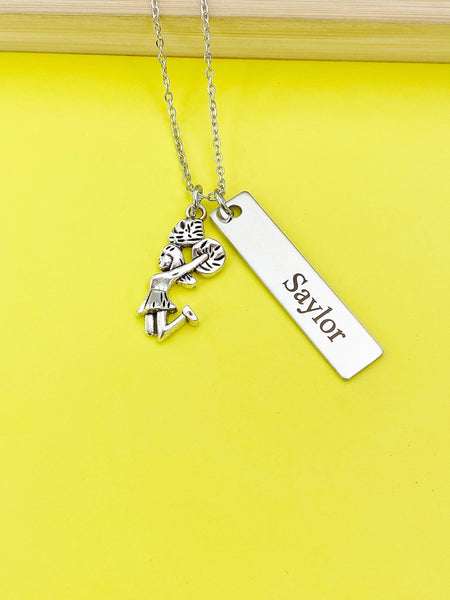 This is an engraving Name on stainless-steel and cheerleader charm with hand stamped initial charm on stainless steel necklace.