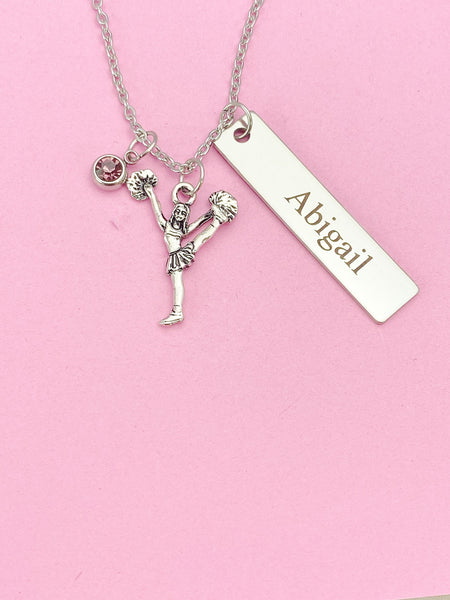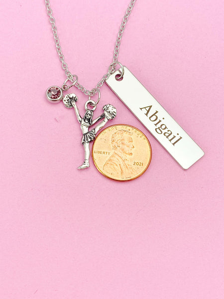 This is an engraving Name on stainless-steel and cheerleader charm with hand stamped initial charm and birthstone charm on stainless steel necklace.