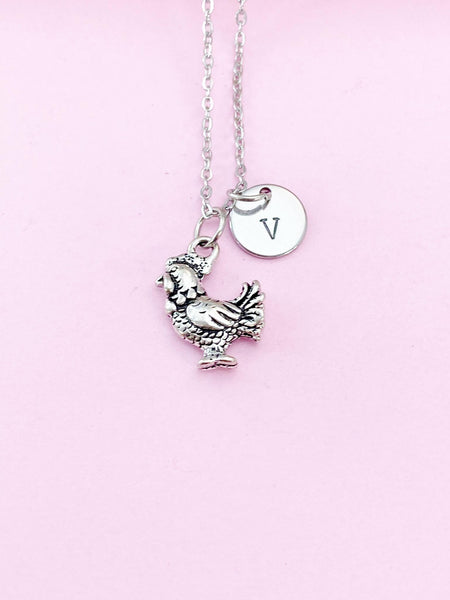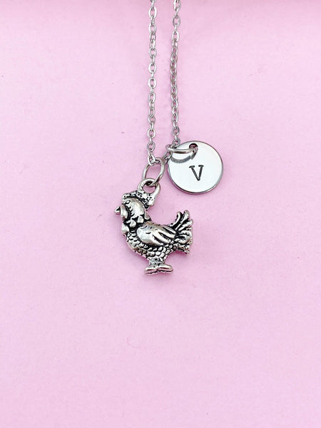 This is silver tone chicken charm with hand stamped initial charm on tarnish resistant stainless-steel chain.