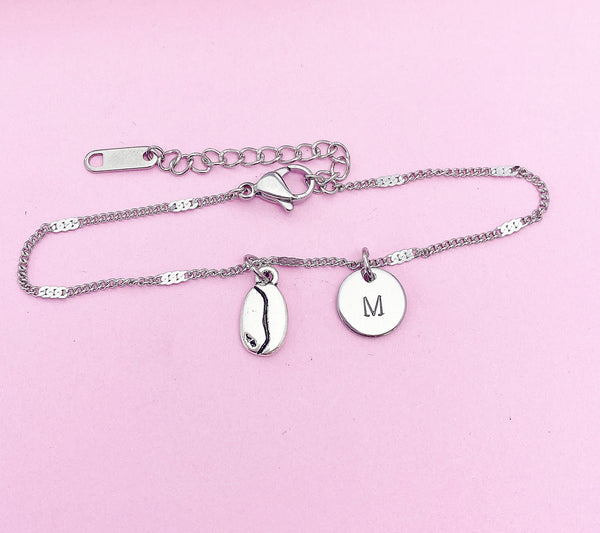 This is a silver-tone coffee bean charm with hand stamped initial charm on stainless steel chain.