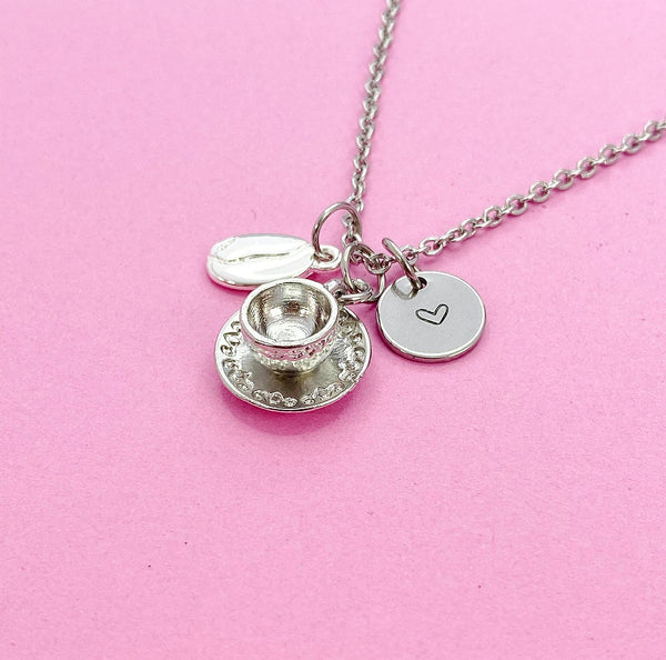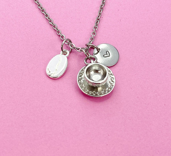 This is a silver-tone Coffee Bean Cup Saucer charm with hand stamped initial charm on tarnish resistant stainless-steel chain.