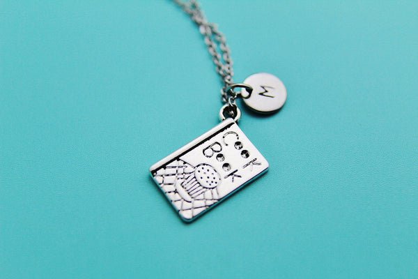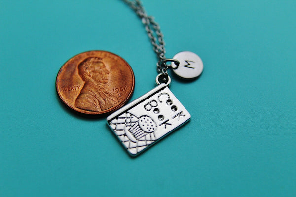 This is a silver tone cookbook charm on brass or stainless-steel chain.