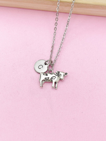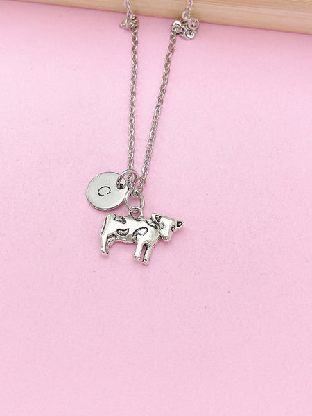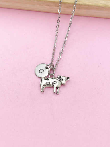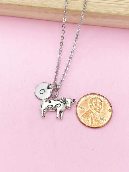 This is a silver-tone cow charm with hand stamped initial charm on brass or tarnish resistant stainless-steel chain.