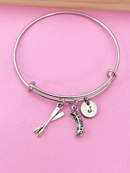 This is silver tone oar charm, canoe charm with hand stamped initial charm on stainless steel bracelet.