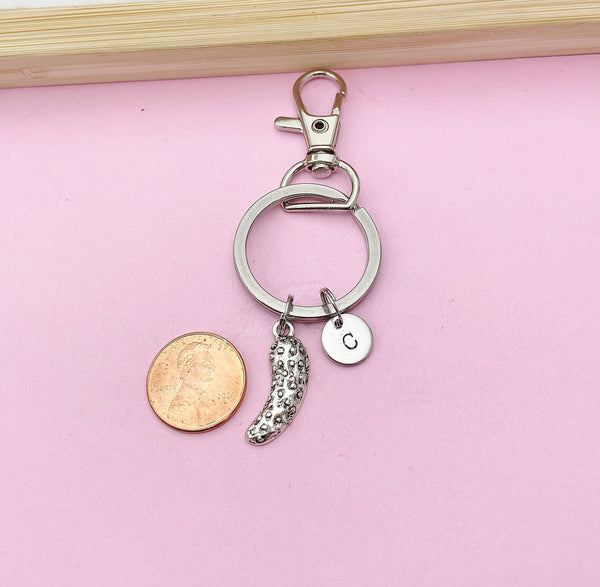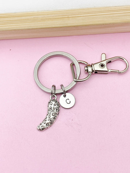 This is a silver-tone cucumber charm with hand stamped initial charm on keyring.
