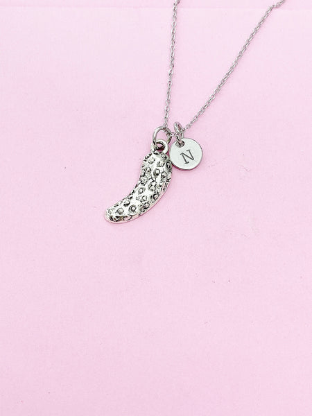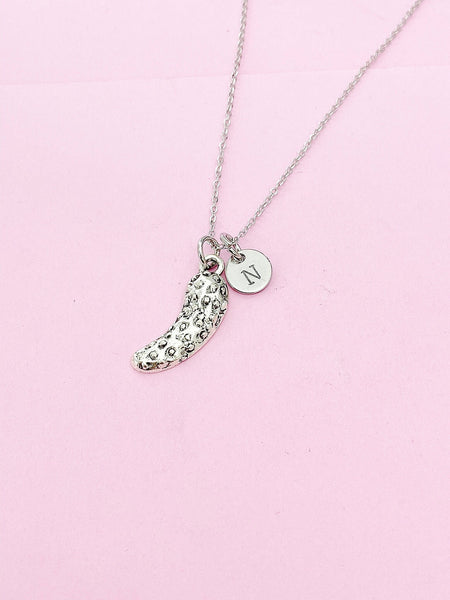 This is a silver -tone cucumber charm with hand stamped initial charm on stainless steel 18 inches chain.