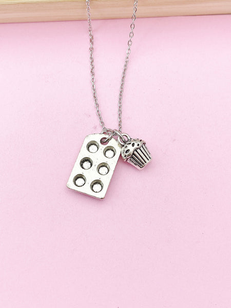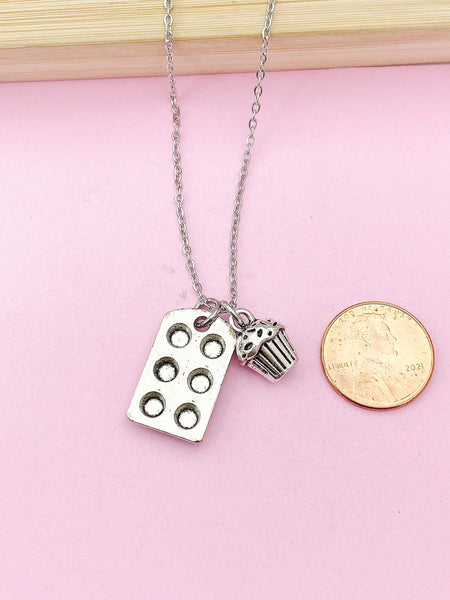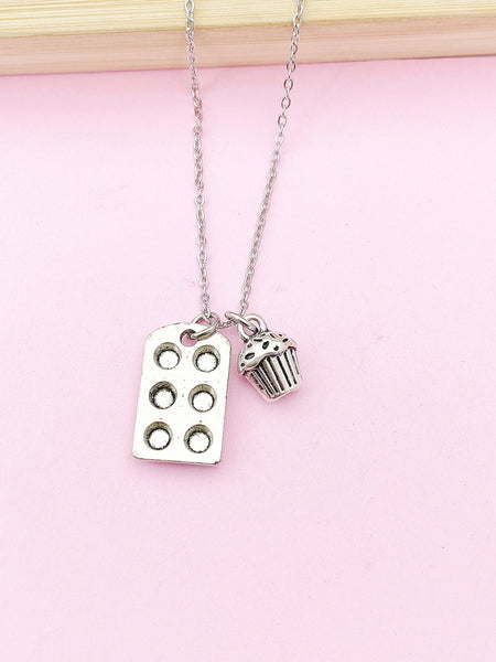 This is a silver-tone baking pan and cupcake charm on brass or tarnish resistant stainless-steel chain.