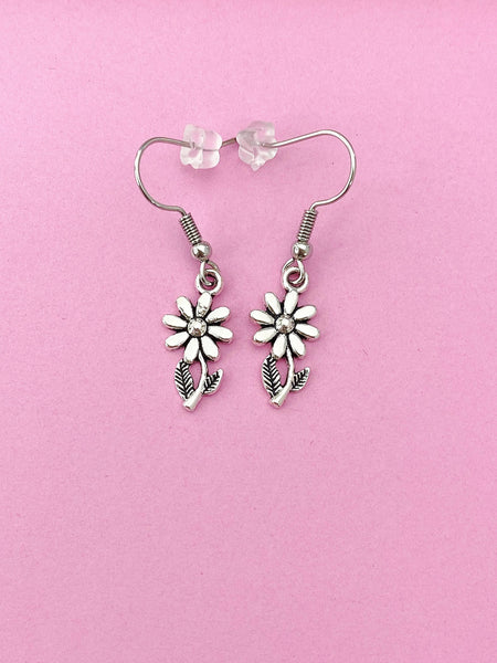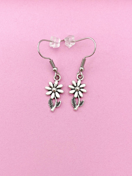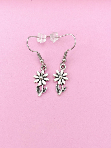 These are silver-toned daisy charms with stainless steel ear hooks.