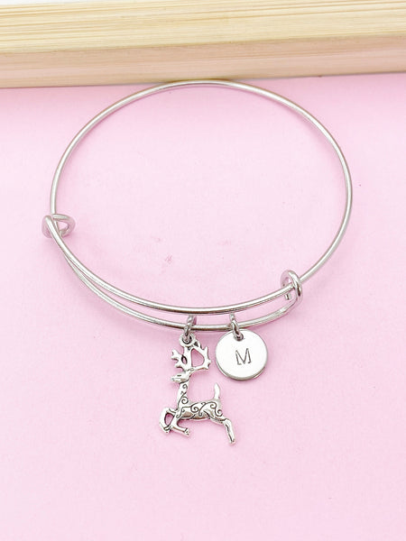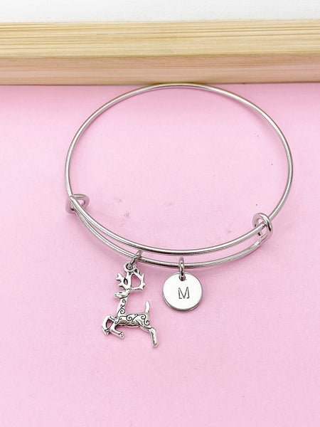 This is a silver-tone deer charm with hand stamped initial charm on Tarnish Resistant stainless steel bracelet.